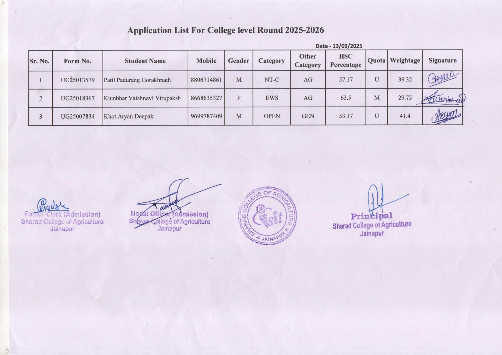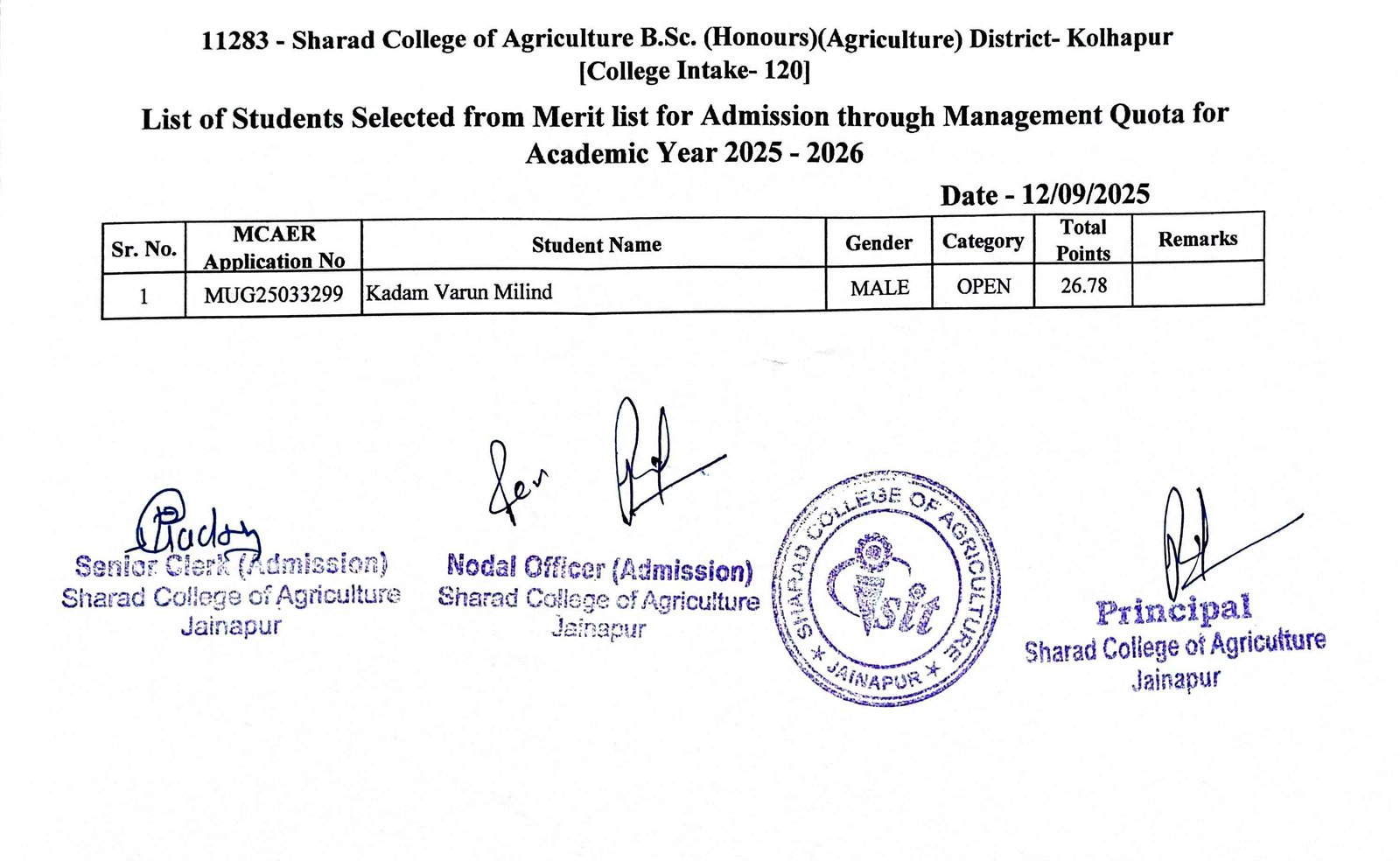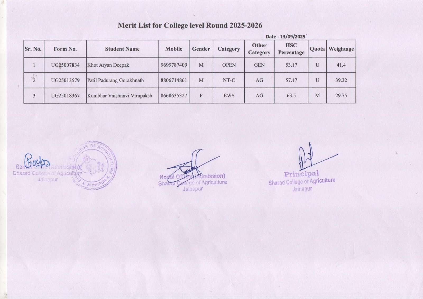 College Level Round Final Merit List 2025-2026