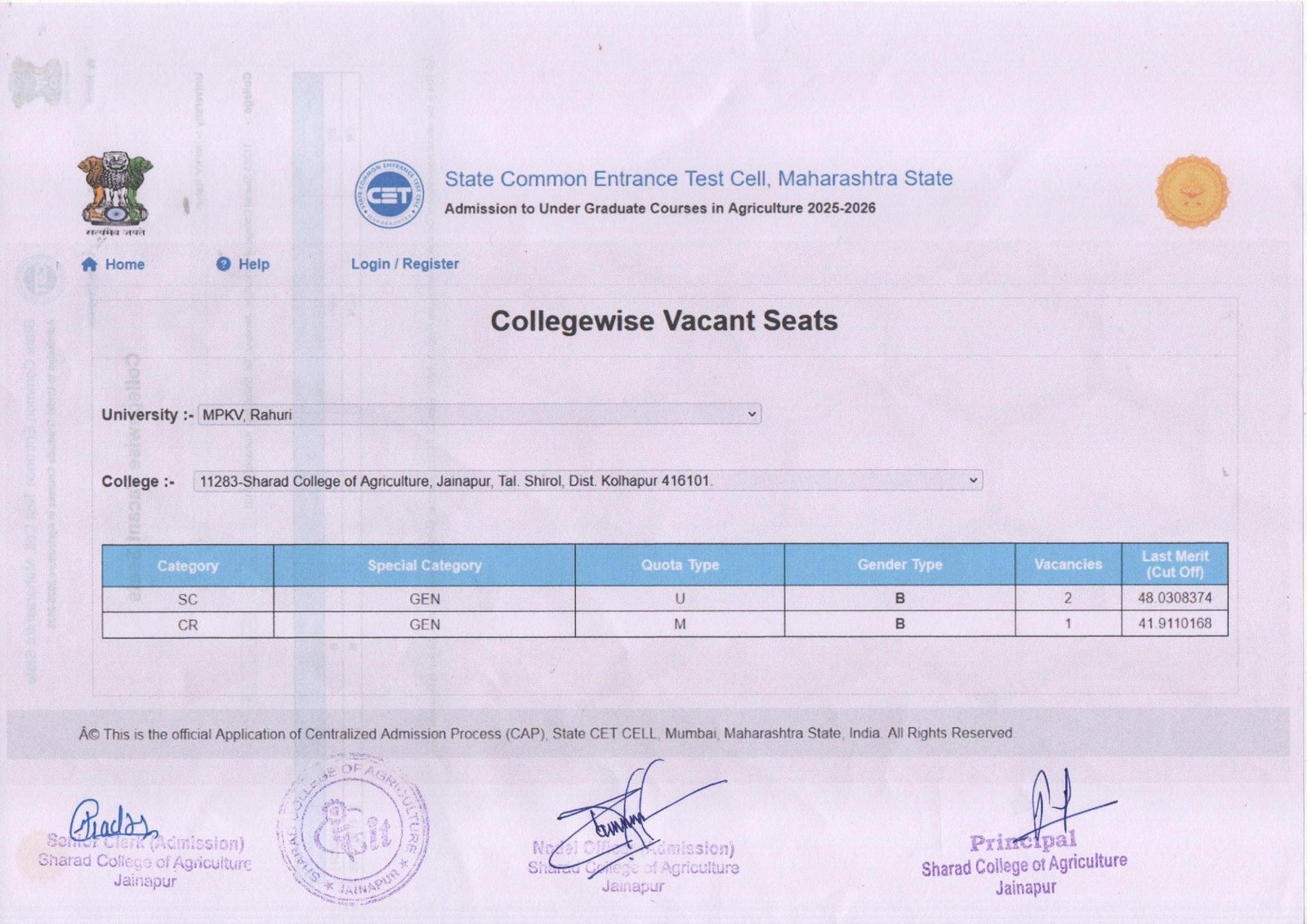 - Centralized online admission process conducted by Maharashtra council of agriculture education and research, Pune; after declaration of 12th science and MHT-CET results
