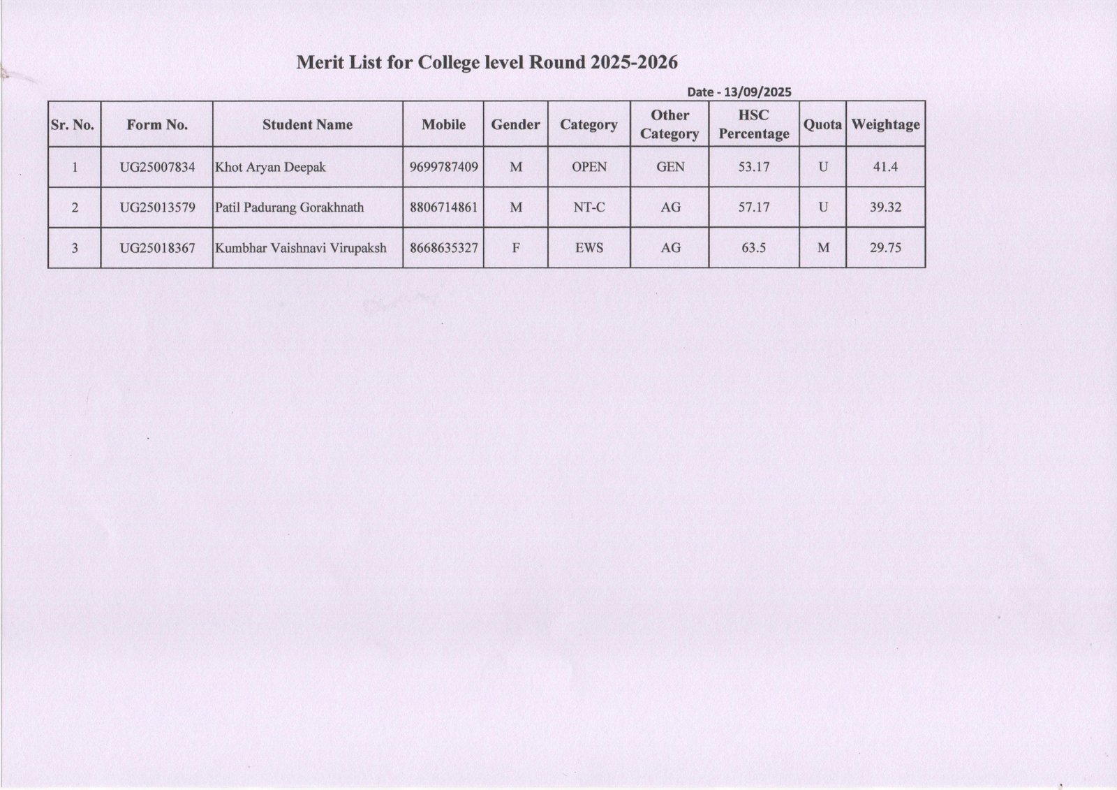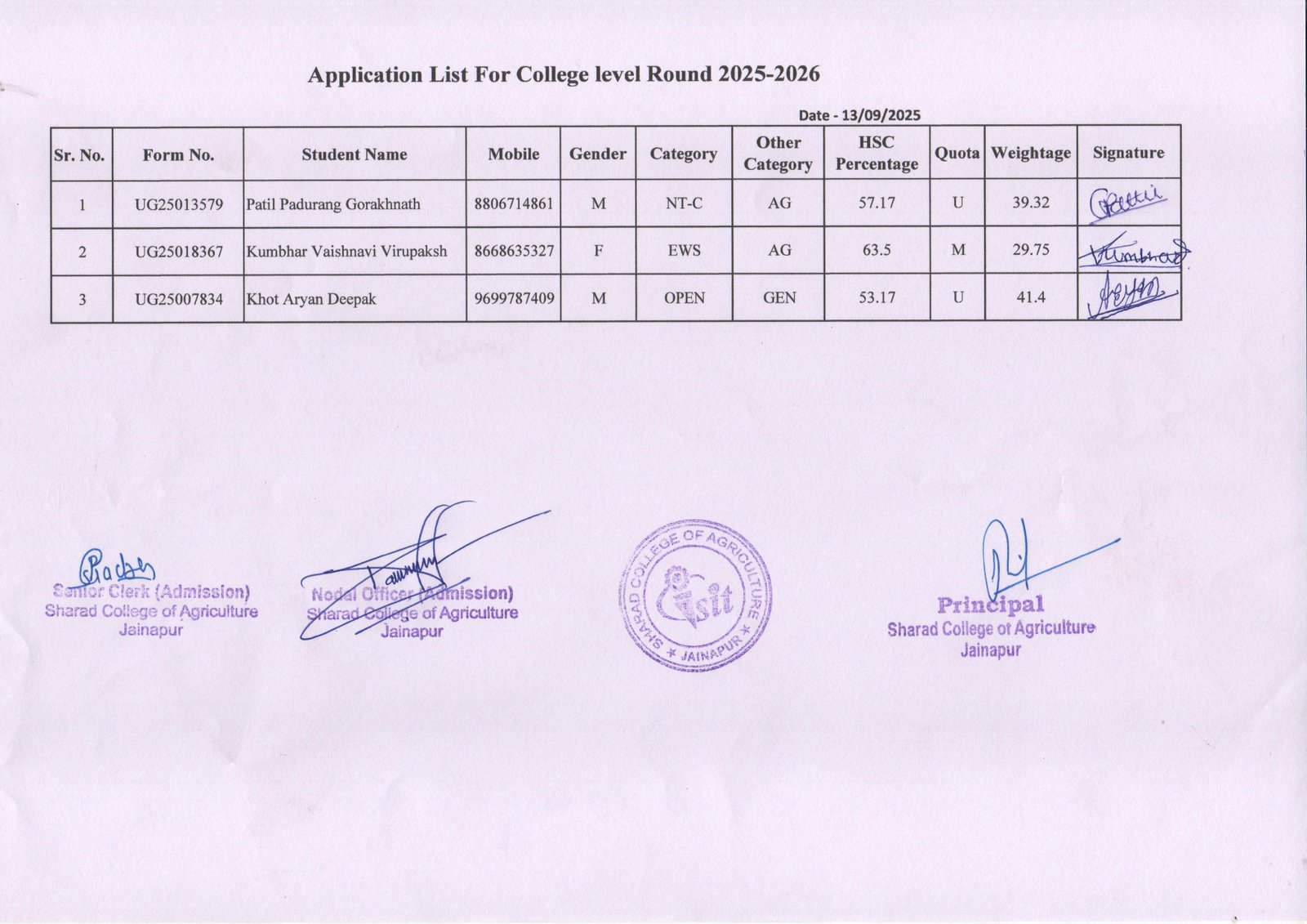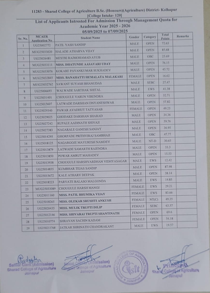 | 2 | MHT – CET /JEE/ NEET/AIEEA-UG Marksheet | √ | √ | √ | √ | √ | √ |